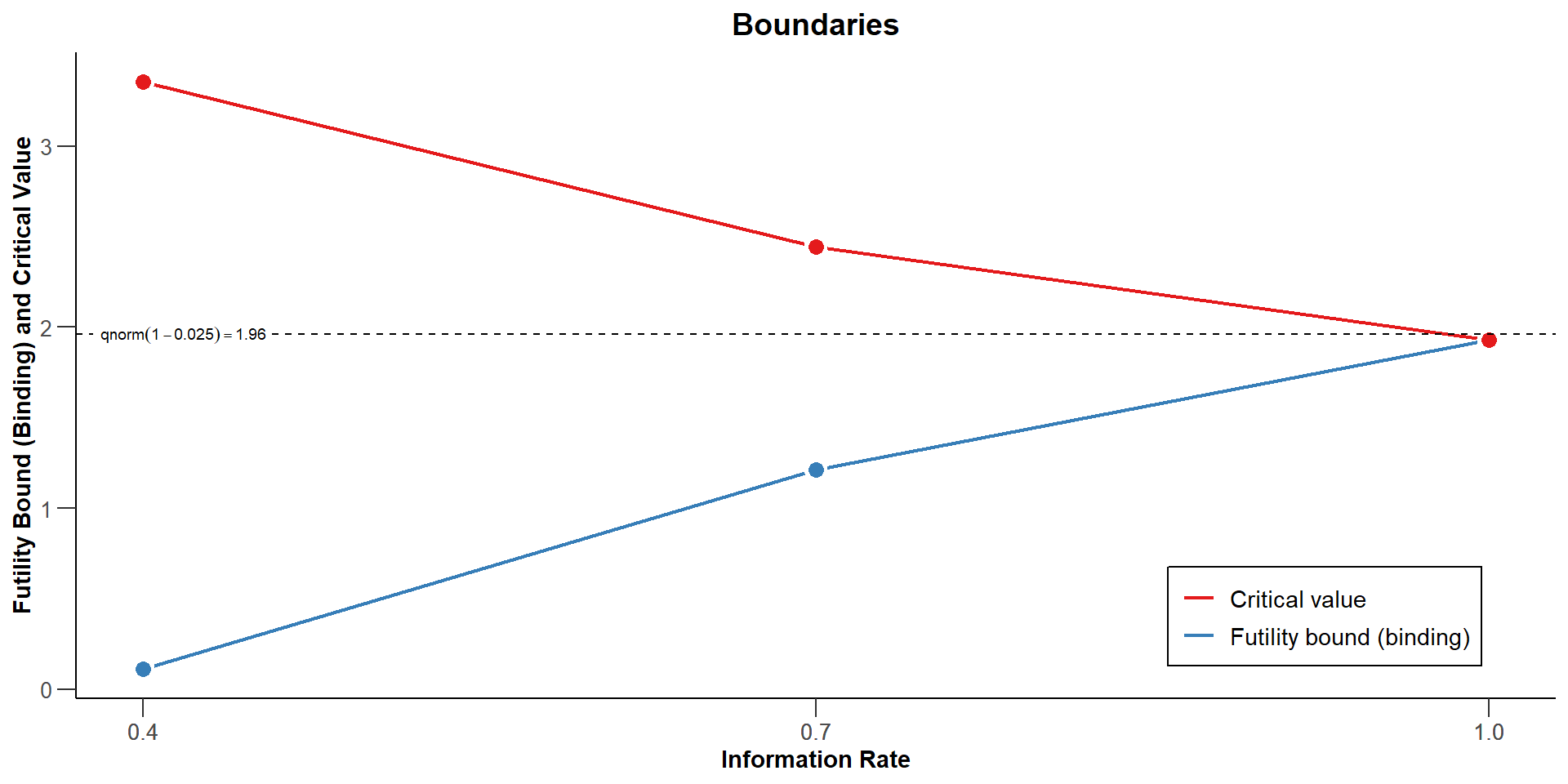 If an accrual time is specified, the calendar times where the interim stages are to be conducted in order to reach the information levels specified for the stages are numerically determined by finding the time points \(t_k\) with